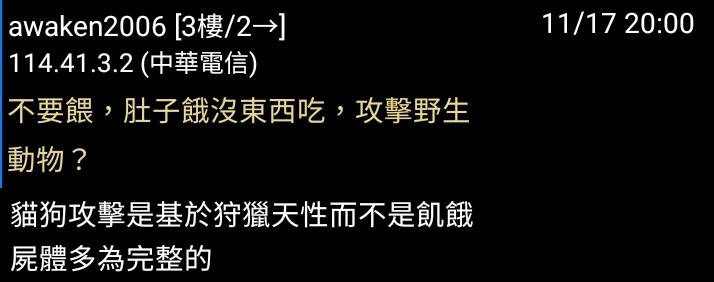→ awaken2006 : 有人投餵,有去攻擊野生動物嗎?114.41.3.2 11/17 20:14