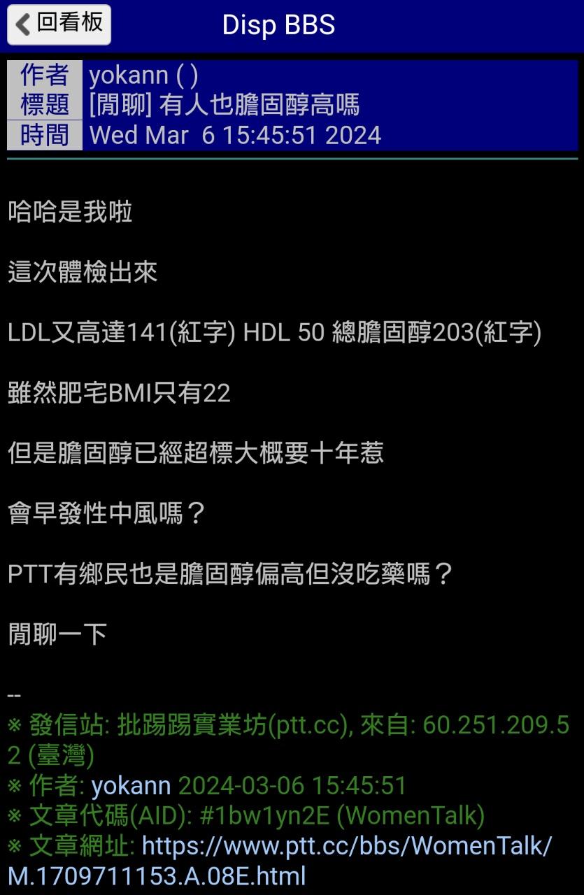 → ukbiz136 : 就不吃了,身體發炎就會讓LDL升高 118.168.83.196 05/19 23:33
