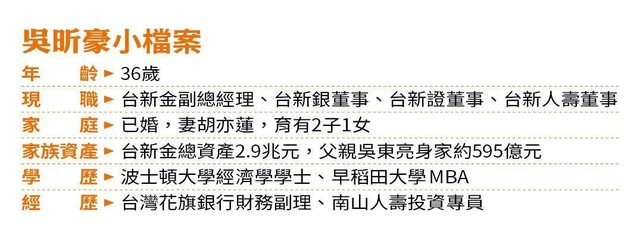 極栽培兒子吳昕豪上位。本刊調查,6月吳東亮成立台新育樂公司,交由么兒、台新金副總