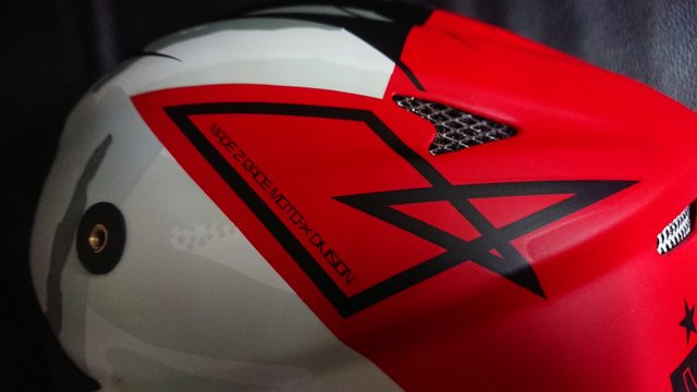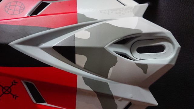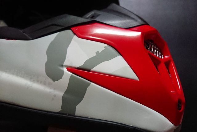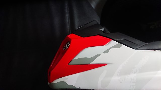 而上方從側面一直延伸到後方紅色區域, 主要的修飾只有這個應該就亂畫的圖案? 至少我看不出來代表什麼,圖案左右都是相同的。 同時這邊也可以看到後方的排氣口以及側面的帽簷鎖點。