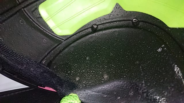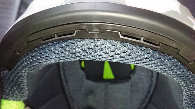 可以看到前額這有明顯的線條, 左右則是前進氣口, 中間黑色墊片是黏死在帽簷鎖點上的。