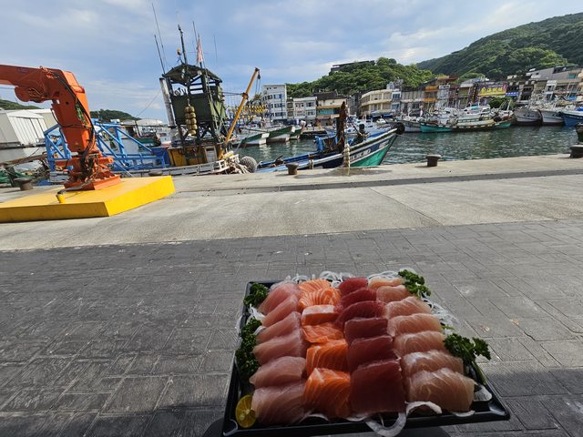作業區找邊邊坐著吃,還可以看到漁船靠岸卸下漁獲