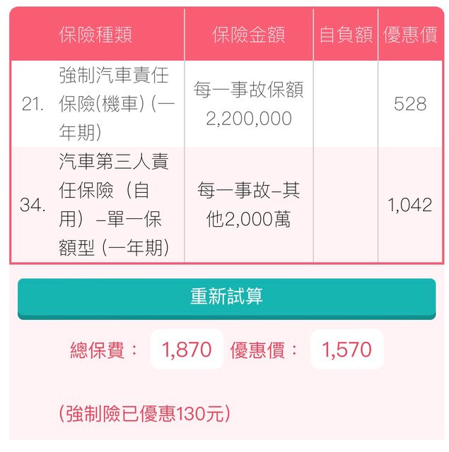 → kmkr122719: 如果沒有特殊原因,強制險/任意險建議 111.71.1.160 10/15 00:17