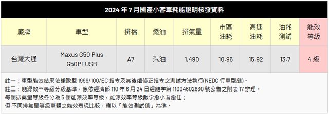 車僅有台灣大通送測 Maxus G50 Plus,繳出平均油耗每公升 13.7 公里的數據,能源效
