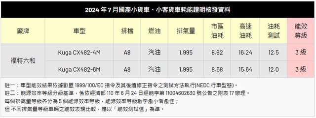 Kuga,從資料來看送測車款皆為 2.0 升排氣量版本,能源效率等級則都是 3 級。