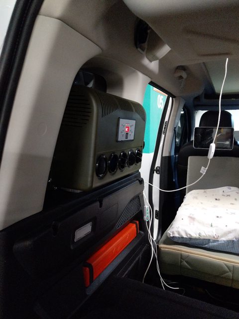 : 還有溫馨的寶獅 Rifter,車主加裝熄火也能吹的冷氣,還有可以變成床的後座,躺下
