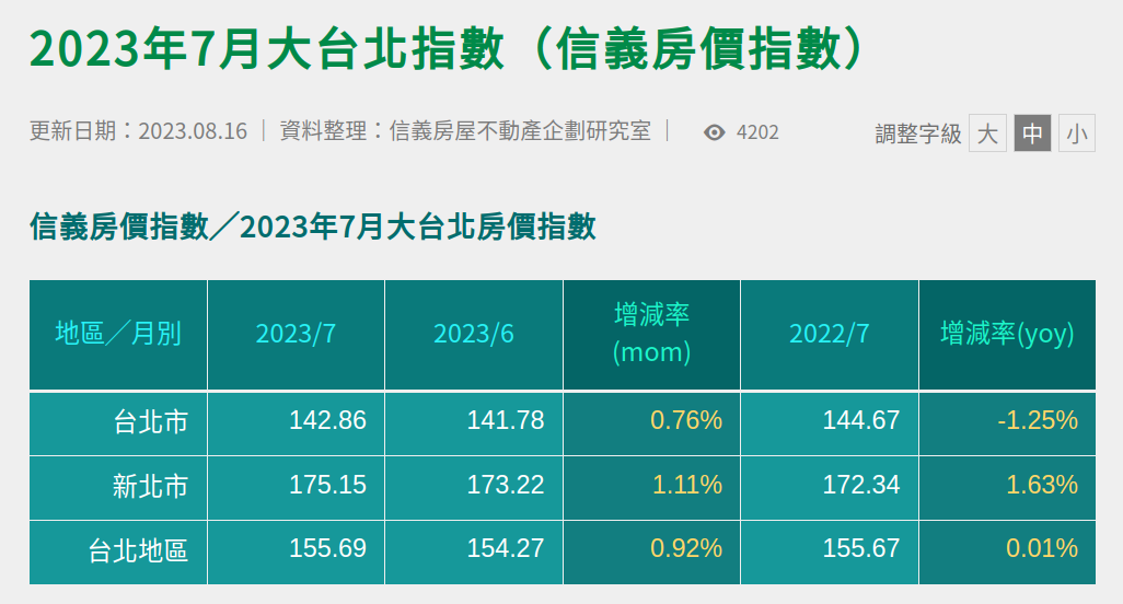 推 Lushen: 新北 MoM +1.11% YoY +1.63% 台北 MoM +0.76% YoY -1.25% 08/16 22:56