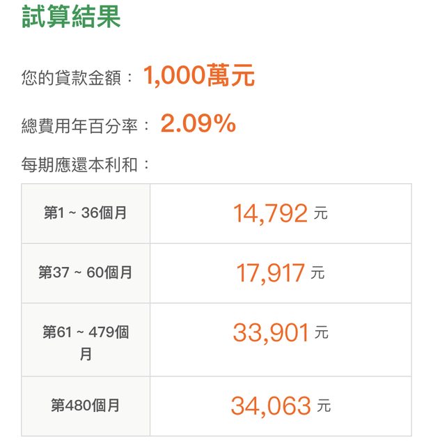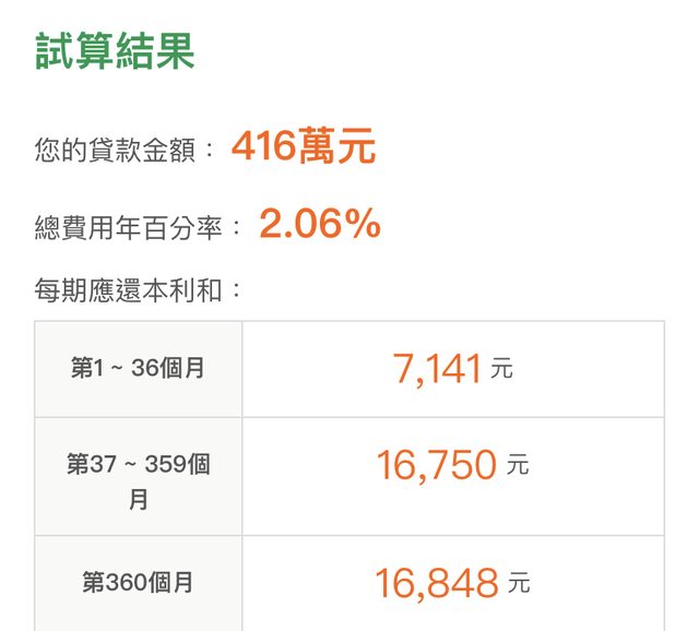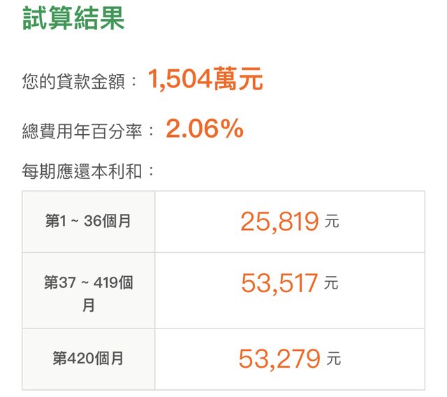 青安貸1000(40+5)+公務員2.06%貸款417萬(30+3)=貸八成