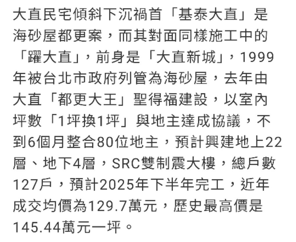 中山區大直街建案「基泰大直」發生塌陷事故,經查該案總戶數為33戶,實價揭露預售已