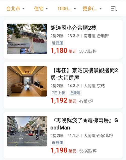 → mayko: 剛剛591隨便找一下,大同區延平國小學那邊是有三房老公寓價 09/10 21:23
