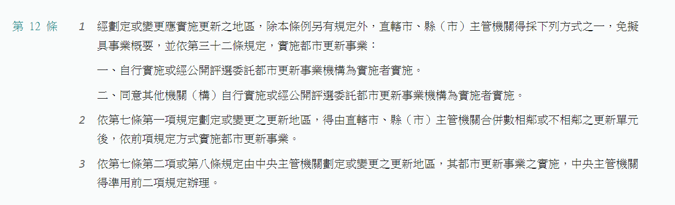 → IBIZA: 都市更新條第十二條第一項, 允許直轄市、縣(市)主管機關 09/12 22:11