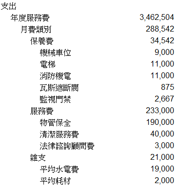 → a386036: 務費8000+電梯維護8000+委外清潔15000+代收垃圾30000 09/22 13:06