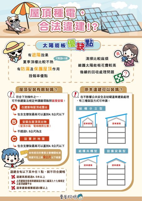 違建可有條件設置太陽光電板;甚至現有社區、公寓設置太陽光電裝置,需住戶同意的門