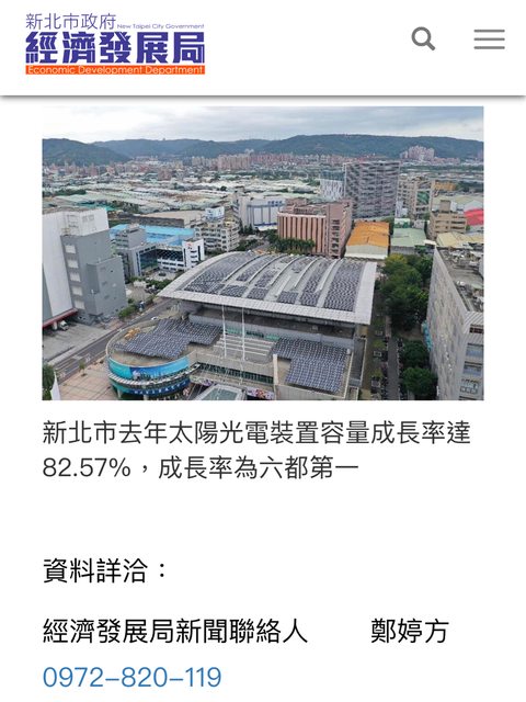 新北市去年太陽光電裝置容量成長率達82.57%,成長率為六都第一