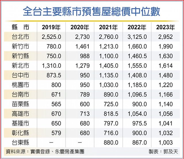 、基隆、彰化、台東等四縣市預售屋中位數房價也都站上千萬元,其中苗栗更因竹科外溢