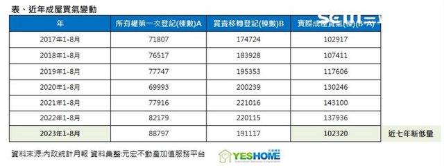 根據六都地政局資料,今年1~8月「買賣移轉棟數」為19.11萬棟、僅年減10.5%,然而,