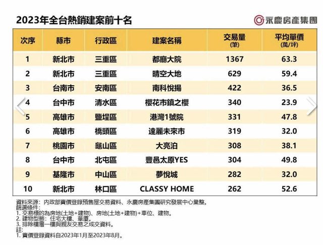永慶房產集團統計實價資料今年全台十大預售熱銷建案,三重區包辦前兩名,其中都廳大
