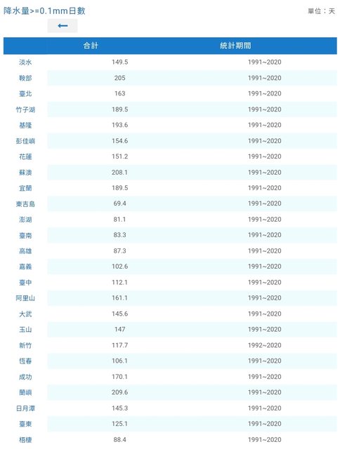 降雨量>=0.1mm天數(一年12個月平均之合計天數):