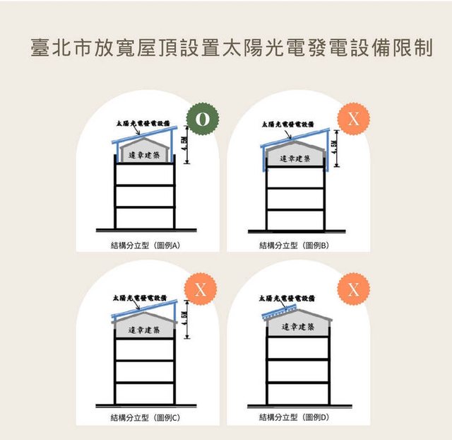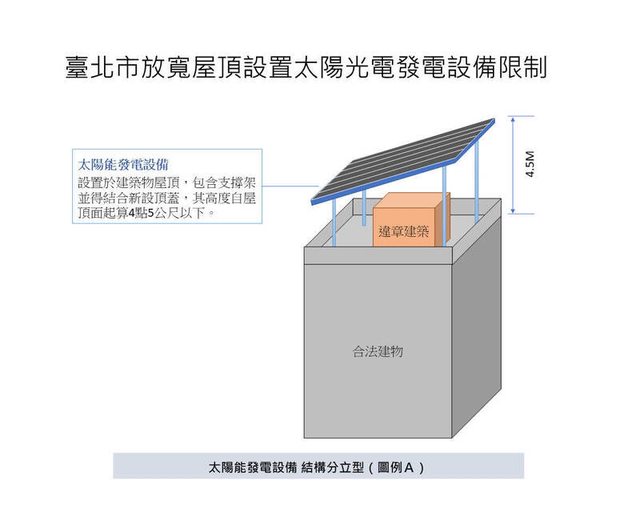會影響違建拆除工作,因此北市公告開放申請設置。但與違建共構連結的太陽能板,因可能