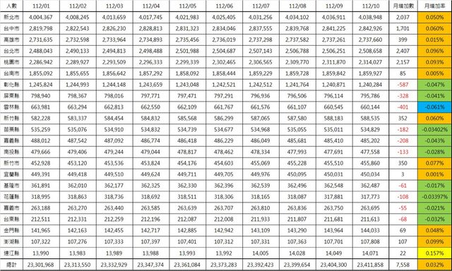 標題[閒聊] 2023年10月全國人口資訊