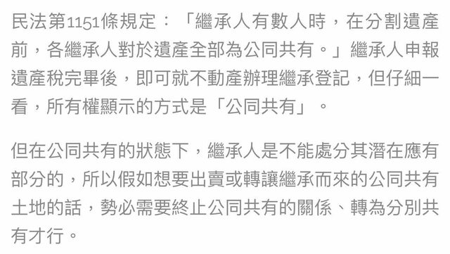 遺產繼承後,沒有辦理分割遺產,就公同共有的部分沒辦法處分的
