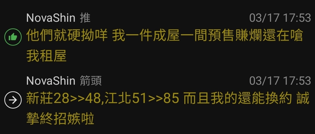 → NovaShin: 一堆掮客只會在那邊吹買幾間 誰跟我大哥一樣直接貼合約 03/17 19:11