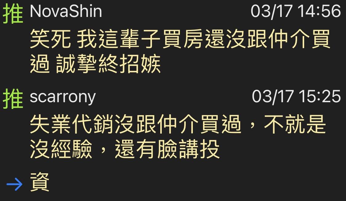 噓 scarrony: 代銷仔到底有沒有賣過房子啊,合意解約都沒處理過03/17 17:54