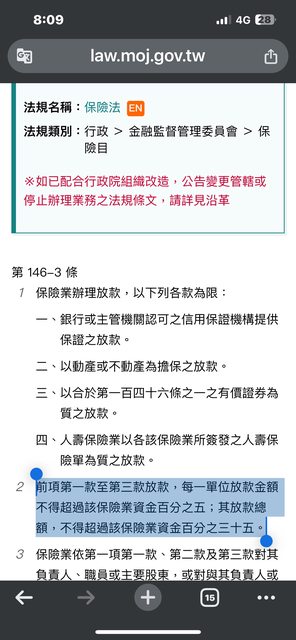 → seangakki11: 不得超過該保險業資金百分之五 08/22 20:19