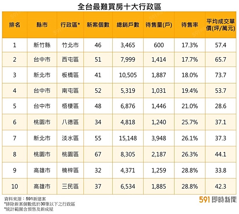 甚麼都要搶?根據591新建案統計六都、新竹縣市新案銷售狀況,在待售率前十低區域中,