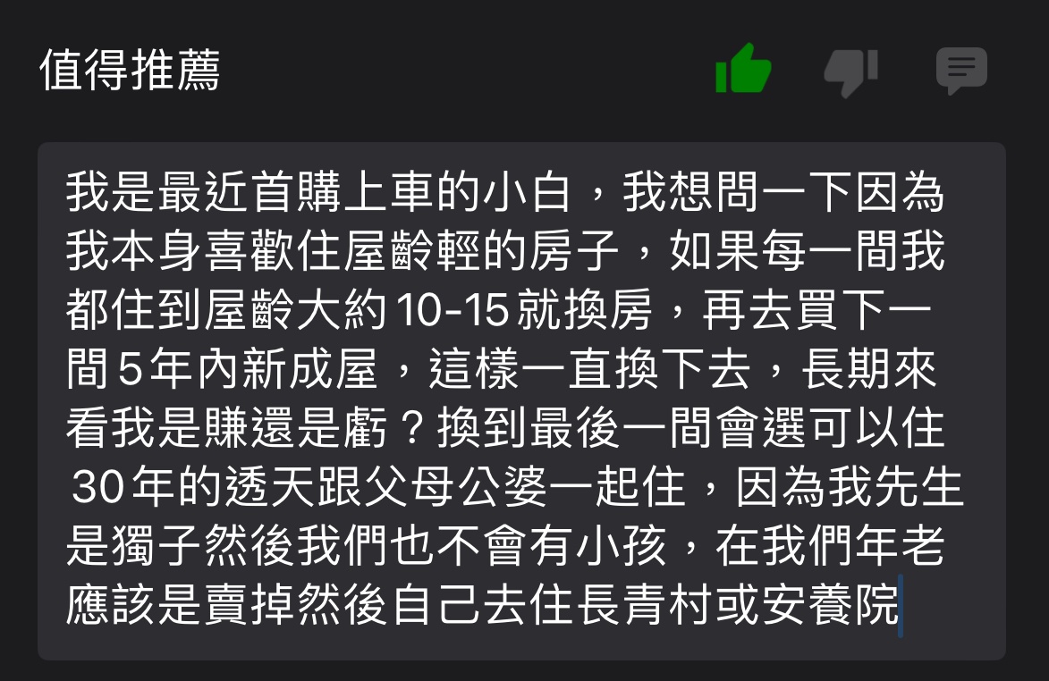 → hanslins: 不多。真的要自住就條件放寬點,地點最重要 09/02 21:14