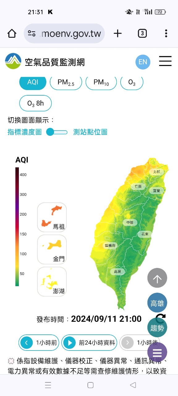 → broncho: 即時空氣品質,基本上苗栗以北明顯較好 09/12 17:05