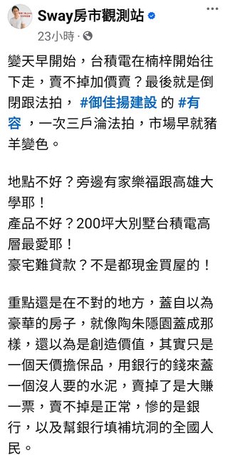 噓 peterklliu72: 賺流量仔..沒在聽他的都賺到買第二第三間了 09/13 09:41