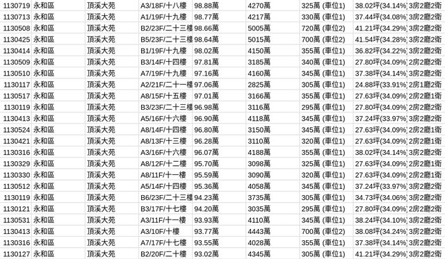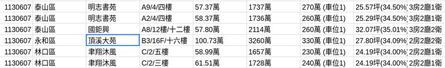 和和」、新店「佳元柒章」及林口「富堡晶鑄」等預售社區,皆出現不少每坪成交單價破