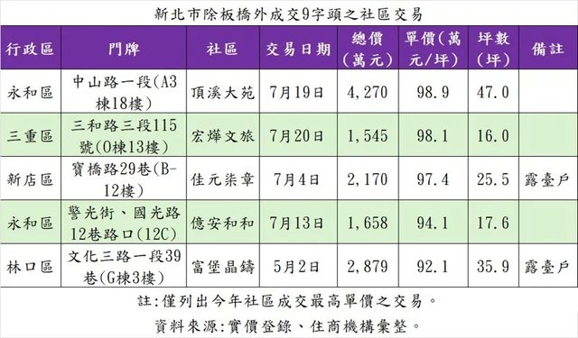、新店及林口等區,今年皆出現單價9字頭成交紀錄,其中近期瘋傳將有新案開價每坪百