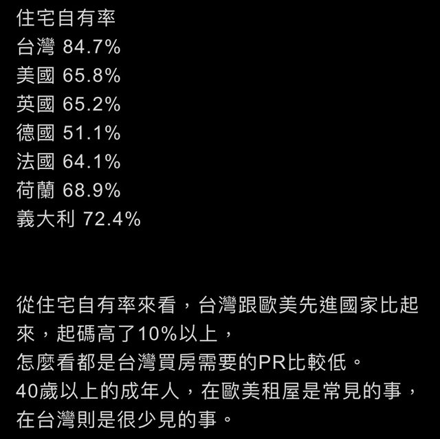 下面自有住宅率則是顯示現實中,台灣相對於其他國家來說,更好買房,也某種程度代表
