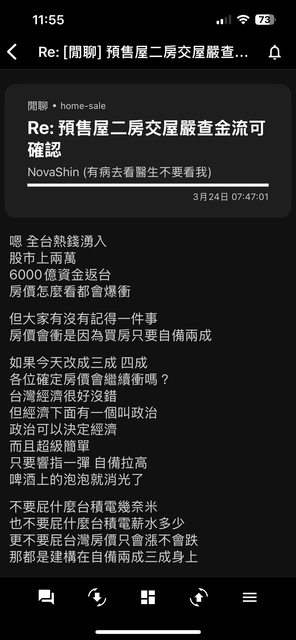→ Tosca: 還是可以拚交屋阿 不是嗎? 你說很痛 廢話打房就是打到你痛09/17 08:57
