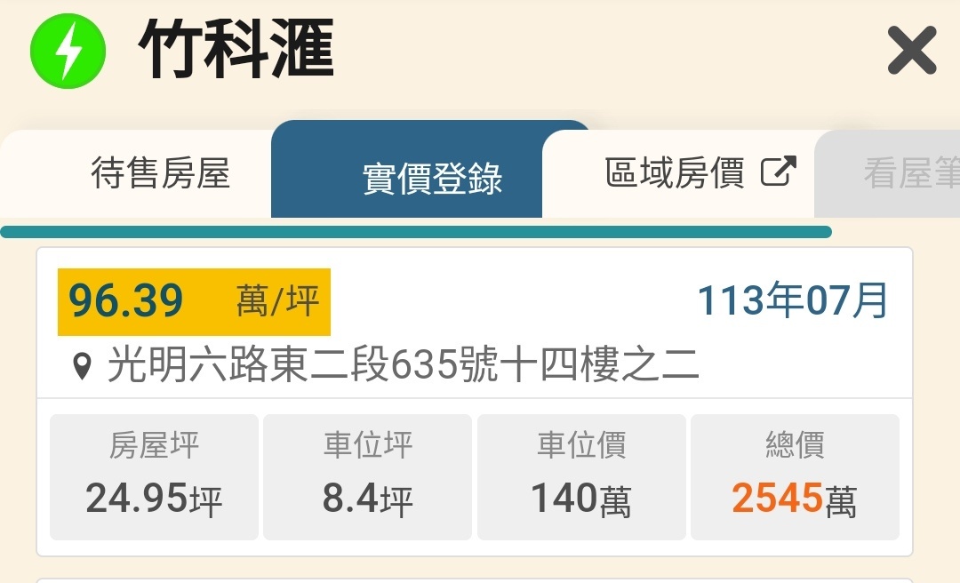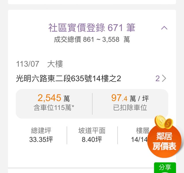 隔壁版看到的 光明六路實價登錄97.4萬 2房車 建坪25坪 總價2545萬 https://i.imgur.com/14GoaRy.jpeg