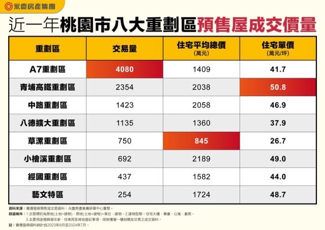 房仲業者統計近一年桃園8個主要重劃區的預售屋房市表現,A7重劃區近一年成交量逾4000件最多,青埔高鐵重劃區成交單價50.8萬元最高。永慶房屋提供