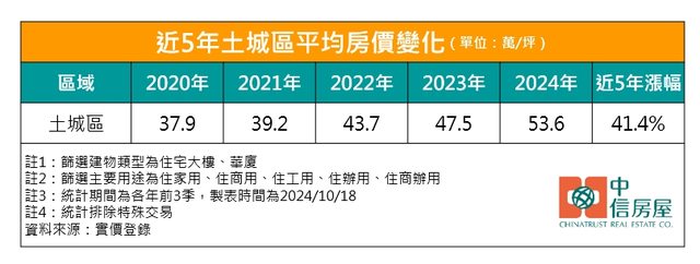中信房屋彙整實價登錄,統計近5年土城區住宅大樓、華廈的平均房價變化,結果顯示目