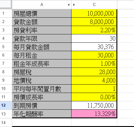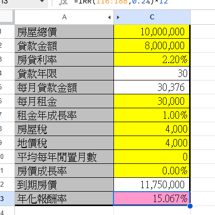 → quiet93: 房價成長率是0,為什麼到期房價是1175萬?這邊看不懂 10/25 13:40