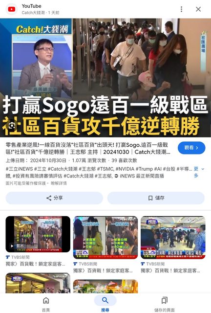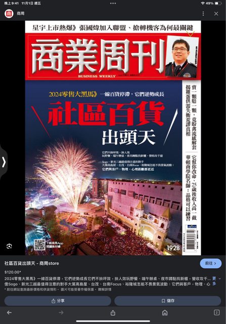 被演算法推到的影片 這一期商週雜誌的 主題是社區百貨出頭天! 業績比新光三越 SOGO還有遠東百貨好 https://i.imgur.com/cYcOurm.jpeg