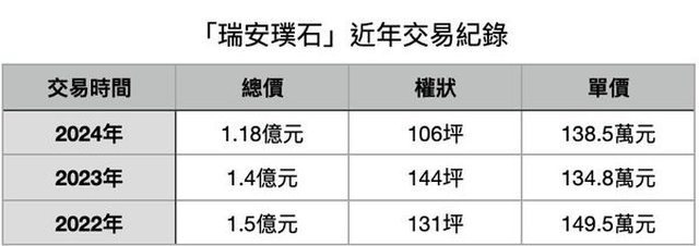 攤開「瑞安璞石」實價登錄紀錄,近期共有3筆成交,單價落在134.8~149.5萬元。