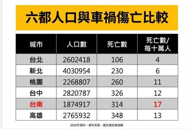 推 cd928: 車禍死亡人數要更新一下吧,那張圖2020的,現在台中是遙遙 11/14 00:22