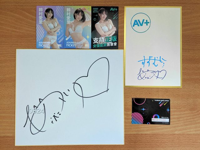 進去攤位的隔間內與鈴村互動合影,收一張鈴村筆跡做的印章現蓋的簽名板