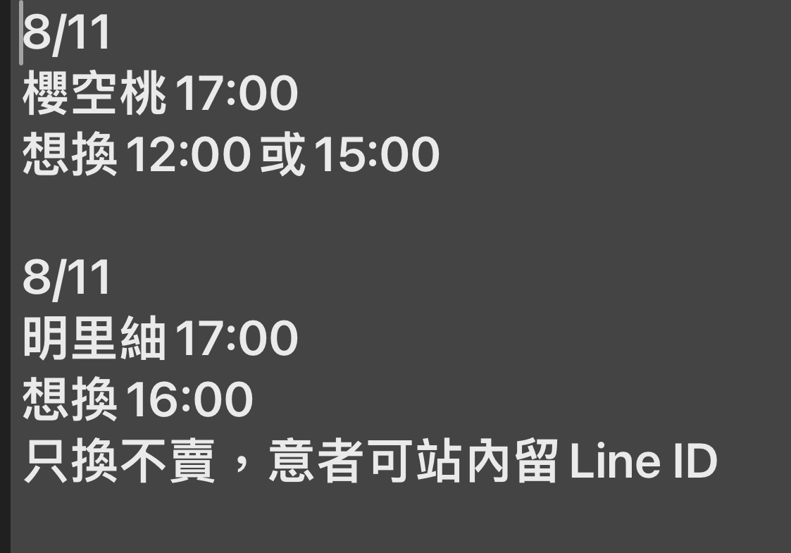 推 e54994182: 以下活動想換時間, 站內信留line 07/28 00:34
