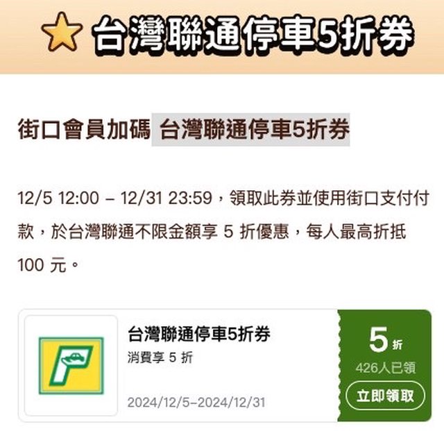 標題[情報] 12/5街口會員日台灣聯通停車5折券