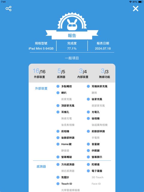 外表無大傷,平板功能都正常,檢測報告如上