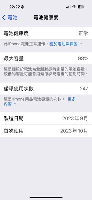 物品狀況:九成新以上品像佳,原廠電池98%健康度,循環次數247,一手機自用,無維修過