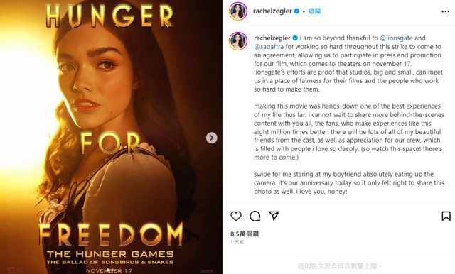 演員工會批准《飢餓遊戲:鳴鳥與游蛇之歌》宣傳行程!瑞秋曾格勒 IG 長文感激