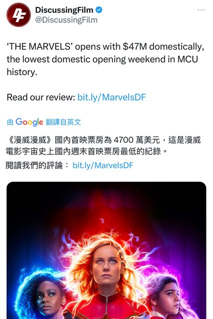 → CCC000 : 驚奇隊長第一集11.3億鎂,第二集都在比爛的是嗎? 11/13 08:12